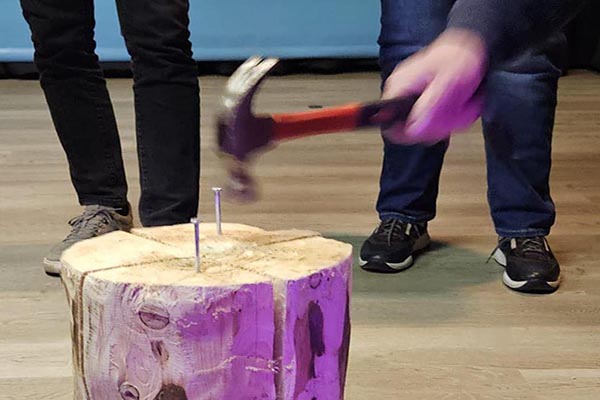 Laat je timmervaardigheden zien! Sla de spijker zo snel mogelijk met een smalle hamer helemaal in de boomstam. Niet zo makkelijk als het lijkt!
